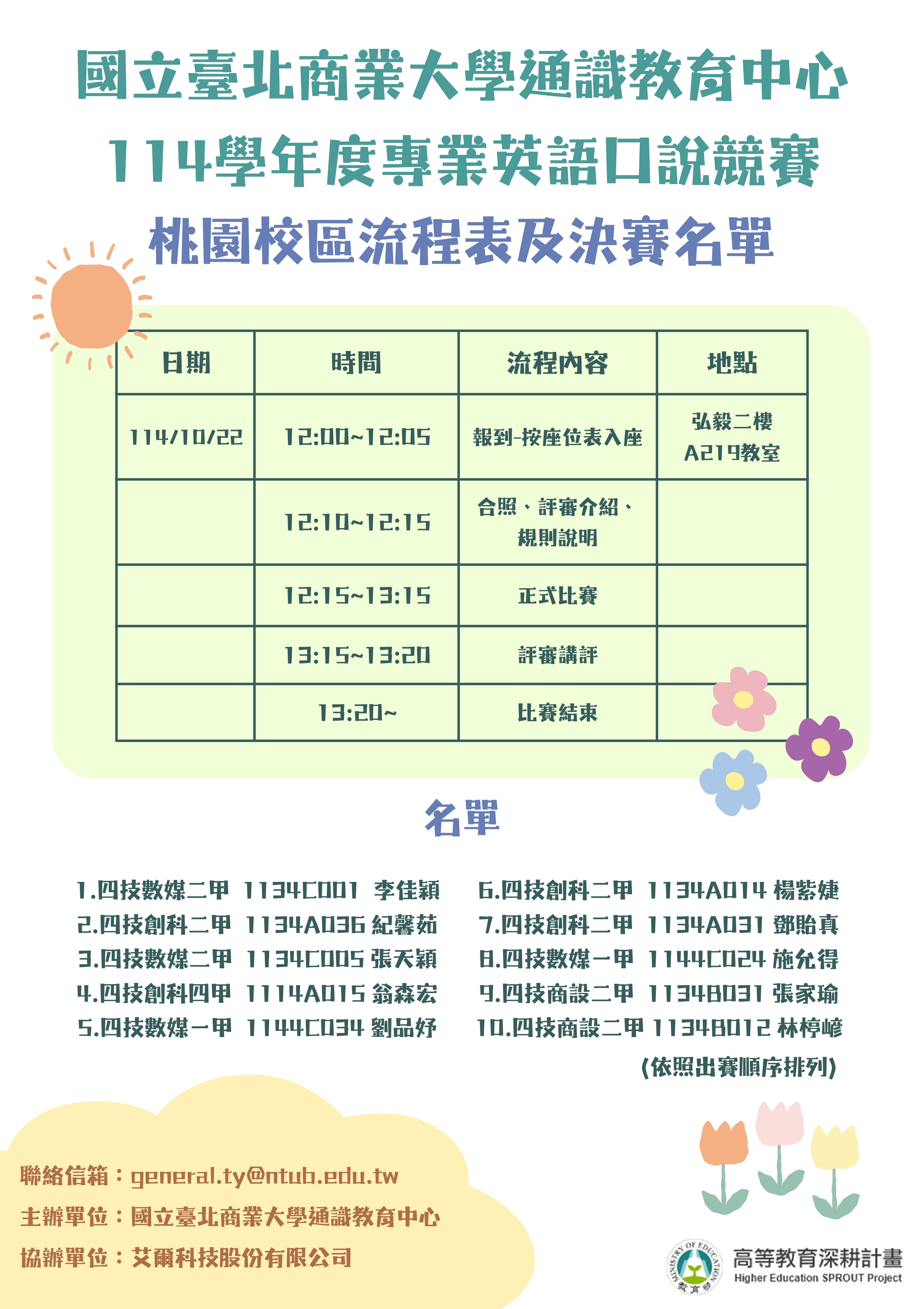 2025北商大挑戰盃—國立臺北商業大學英語口說大賽活動流程表及決賽名單【桃園校區】