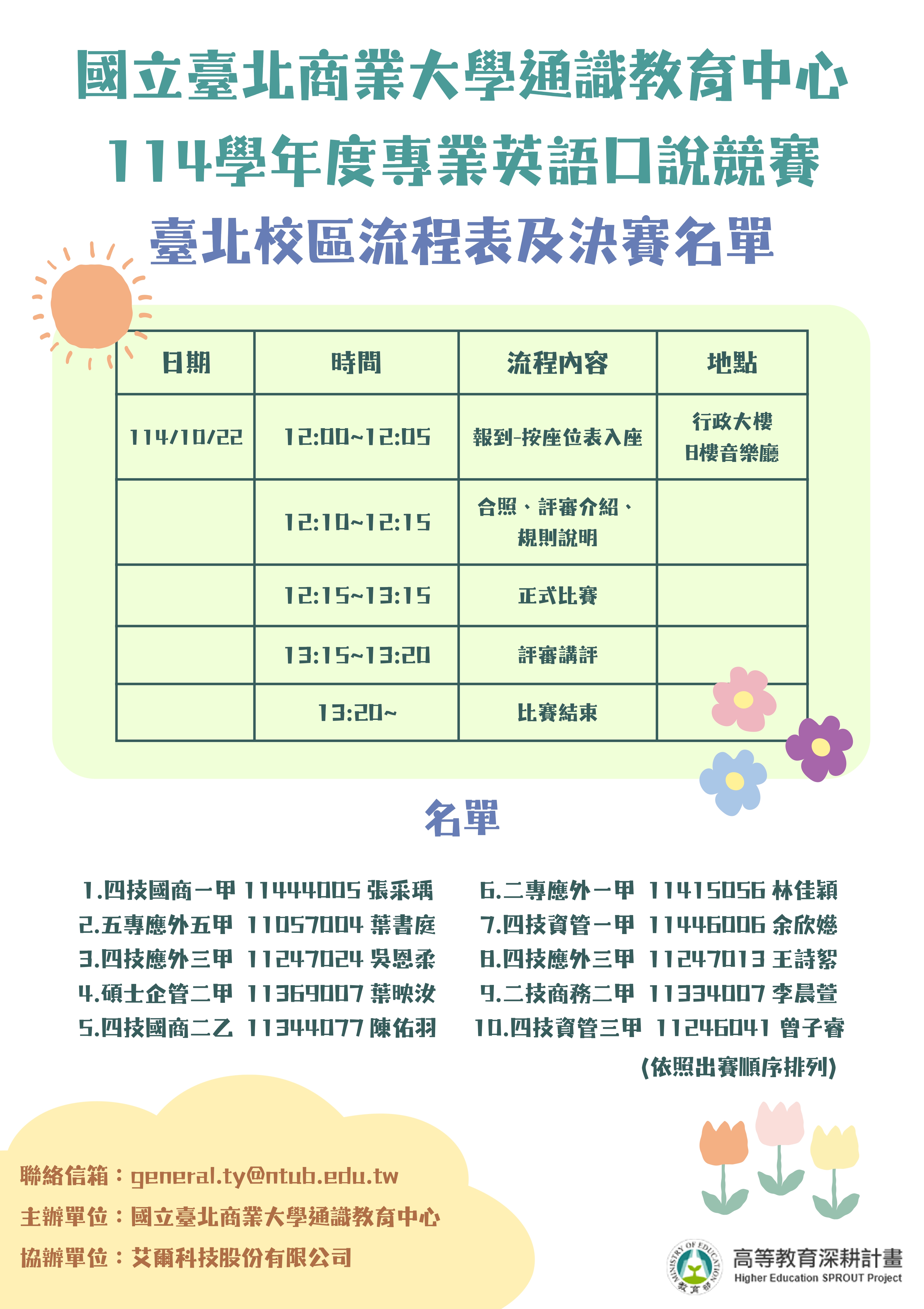 2025北商大挑戰盃—國立臺北商業大學英語口說大賽活動流程表及決賽名單【台北校區】