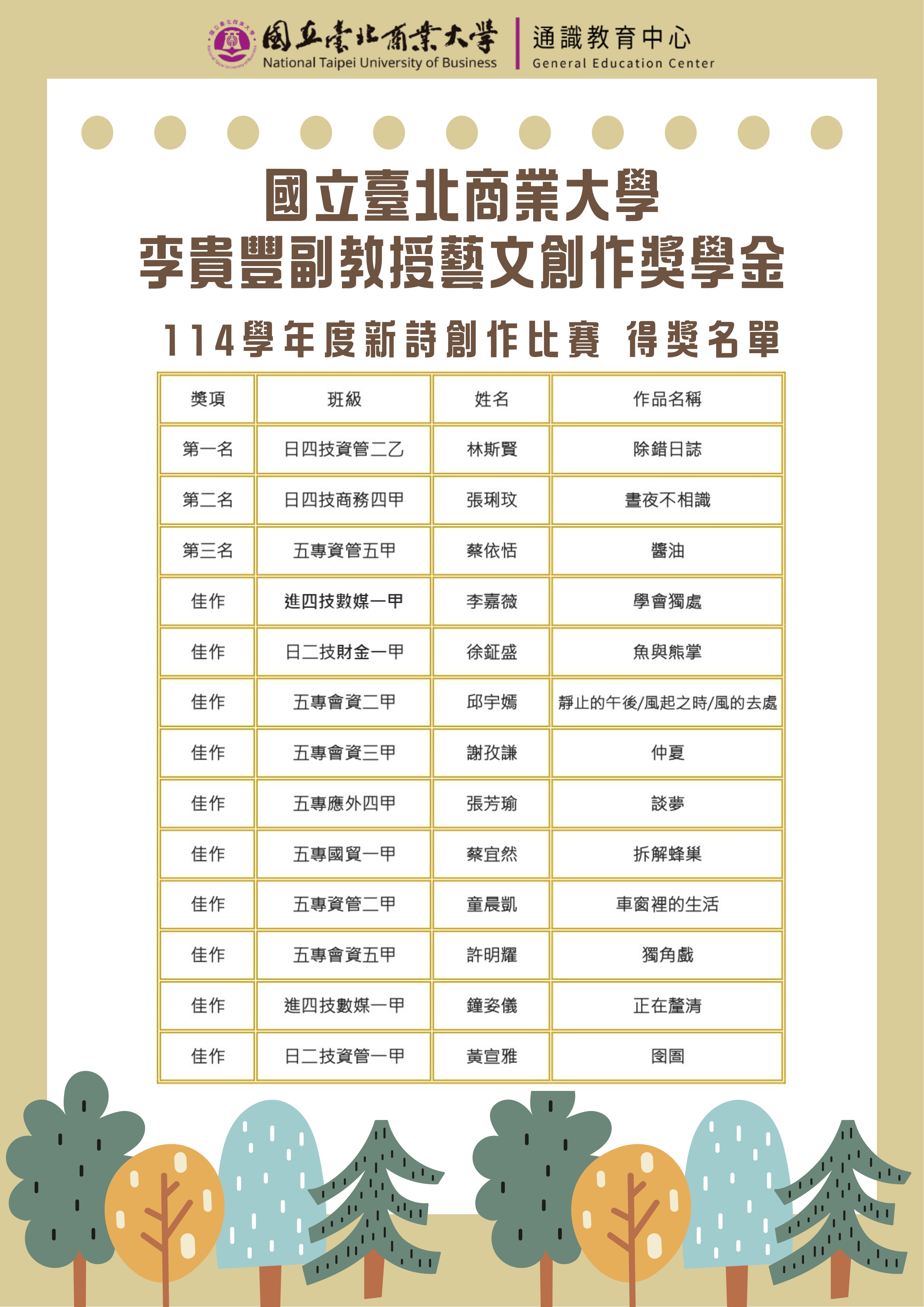賀!【114學年度】李貴豐副教授藝文創作獎學金新詩創作比賽得獎名單公告
